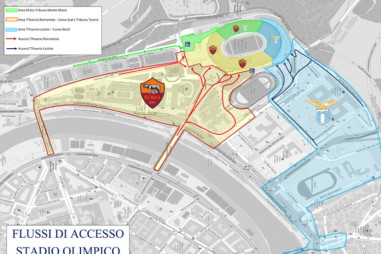 Evitato il contatto tra due gruppi di tifosi fuori dallo stadio Olimpico dov'è iniziato l'afflusso per il derby di stasera. Dopo l'ingresso all'interno dello stadio dei gruppi riconducibili alle due componenti ultras,si è registrata la presenza di due gruppi,pari a 300 persone,in piazzale ponte Milvio e nei pressi del bar River. In entrambi i casi,molti dei componenti aveva il volto travisato,indossando caschi e oggetti atti ad offendere. Lo schieramento delle Forze di Polizia a delimitare il confine delle aree rispettivamente destinate a ciascuna tifoseria,così come già pianificato dalla Questura,ha consentito di impedire l'avanzare del gruppo dei tifosi romanisti,così come dei sostenitori laziali,ciascuno dei quali è rimasto nella posizione iniziale. Sequestrati coltelli,lance,spranghe e bombe carta ad entrambi i gruppi ultras nei servizi preventivi in vista del derby di stasera tra Roma e Lazio. Denunciato un tifoso laziale del gruppo autore delle coreografie. Durante le attività di bonifica sono stati trovati e sequestrati - su entrambi i fronti delle tifoserie ultras - numerosi oggetti atti ad offendere e contundenti. Tra questi aste in plastica modificate con punte metalliche taglienti,coltelli da cucina,mazze da baseball,mazze di legno,alcune delle quali anche abbinate a botti ad elevato potenziale. Numerosi sono anche i coltelli che sono stati trovati all'interno di alcune aiuole,in particolare nell'area nord dello stadio.
